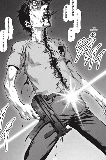 Seichiro is sliced in half by the UGVs combat drone's laser emitter.